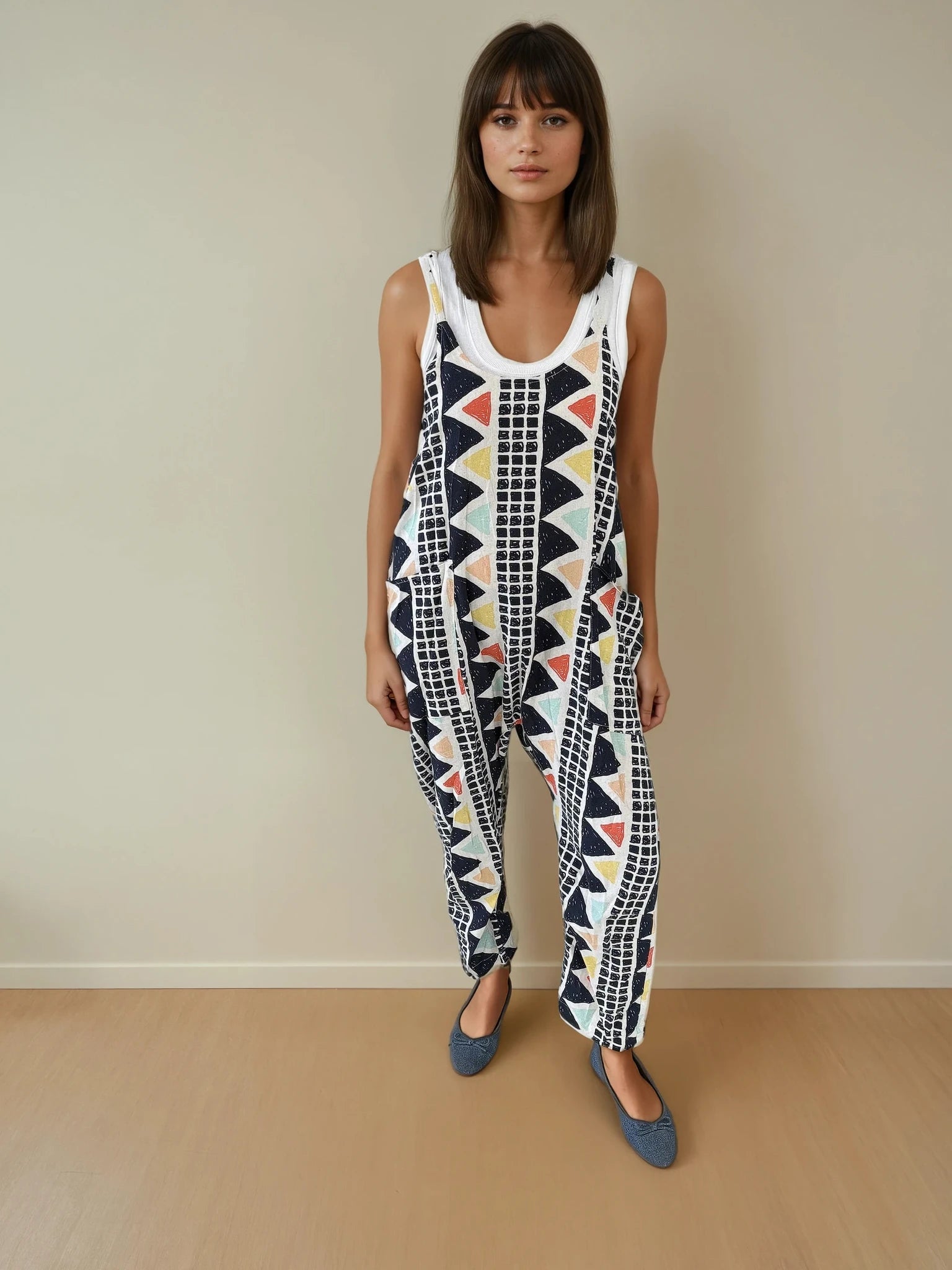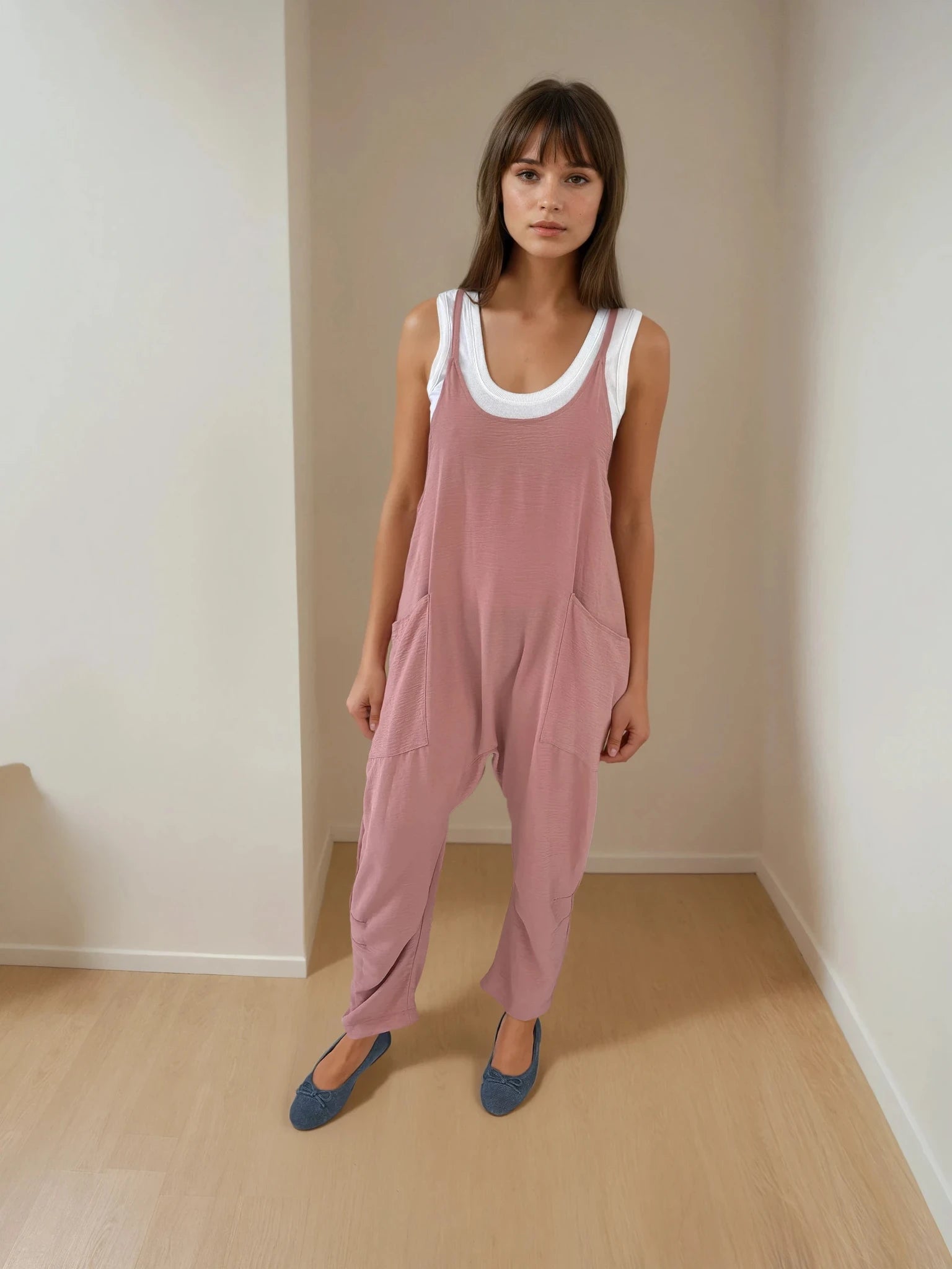 Jumpsuit de tela ligera con corte relajado y tirantes delgados. Diseño cómodo y versátil con bolsillos laterales y caída fluida.